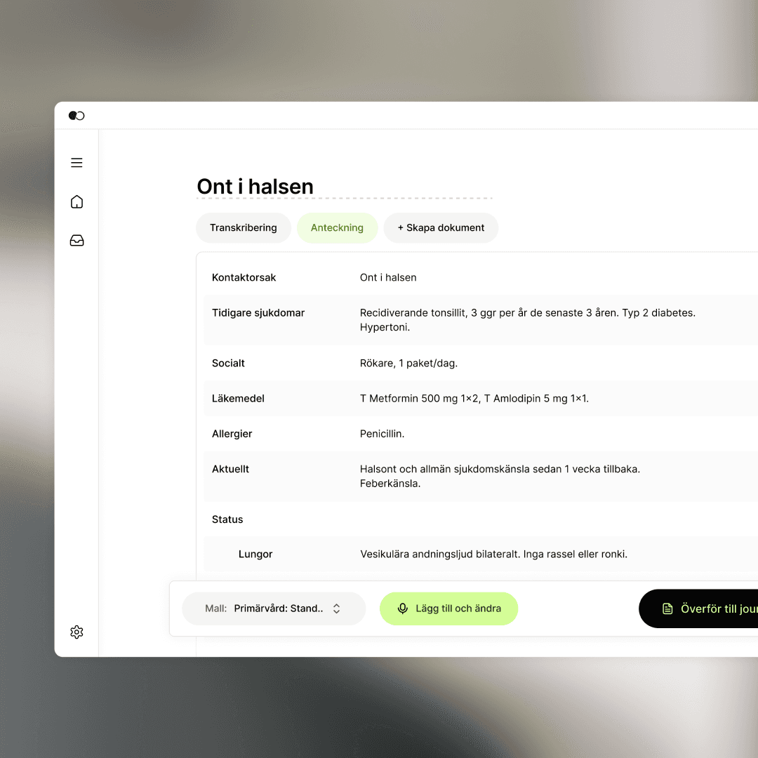 Tandem fångar patientbesöket och skapar din journalanteckning direkt, redo att granskas och överföras med ett klick till ditt journalsystem.